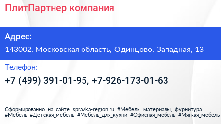 ПлитПартнер, компания по адресу 143002, Московская область, Одинцово, Западная, 13 в дальнейшем Организация, размещена в следующих категориях: