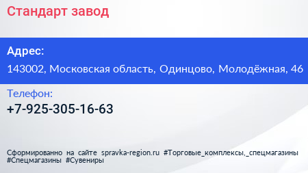 Стандарт, завод по адресу 143002, Московская область, Одинцово, Молодёжная, 46 в дальнейшем Организация, размещена в следующих категориях:
