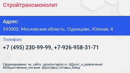 Стройтрансмонолит по адресу 143002, Московская область, Одинцово, Южная, 4 в дальнейшем Организация, размещена в следующих категориях:
