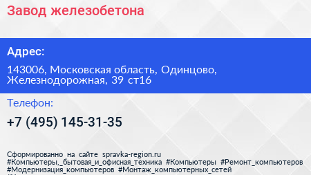 Завод железобетона по адресу 143006, Московская область, Одинцово, Железнодорожная, 39 ст16 в дальнейшем Организация, размещена в следующих категориях: