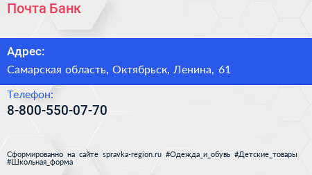 Почта Банк по адресу Самарская область, Октябрьск, Ленина, 61 в дальнейшем Организация, размещена в следующих категориях: