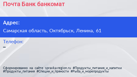 Почта Банк, банкомат по адресу Самарская область, Октябрьск, Ленина, 61 в дальнейшем Организация, размещена в следующих категориях: