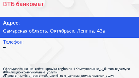 ВТБ, банкомат по адресу Самарская область, Октябрьск, Ленина, 43а в дальнейшем Организация, размещена в следующих категориях: