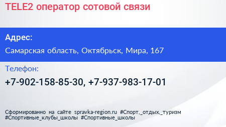 TELE2, оператор сотовой связи по адресу Самарская область, Октябрьск, Мира, 167 в дальнейшем Организация, размещена в следующих категориях: