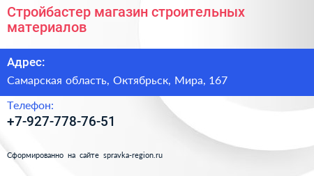 Стройбастер, магазин строительных материалов по адресу Самарская область, Октябрьск, Мира, 167 в дальнейшем Организация, размещена в следующих категориях: