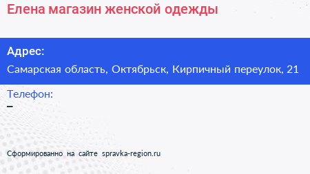 Елена, магазин женской одежды по адресу Самарская область, Октябрьск, Кирпичный переулок, 21 в дальнейшем Организация, размещена в следующих категориях: