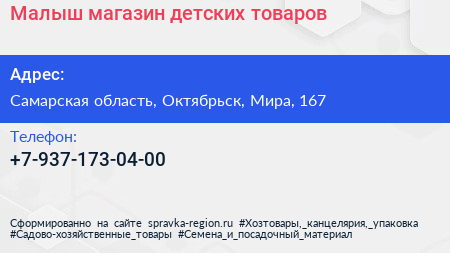 Малыш, магазин детских товаров по адресу Самарская область, Октябрьск, Мира, 167 в дальнейшем Организация, размещена в следующих категориях: