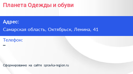 Планета Одежды и обуви по адресу Самарская область, Октябрьск, Ленина, 41 в дальнейшем Организация, размещена в следующих категориях: