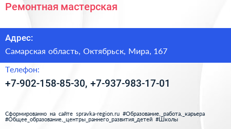 Ремонтная мастерская по адресу Самарская область, Октябрьск, Мира, 167 в дальнейшем Организация, размещена в следующих категориях: