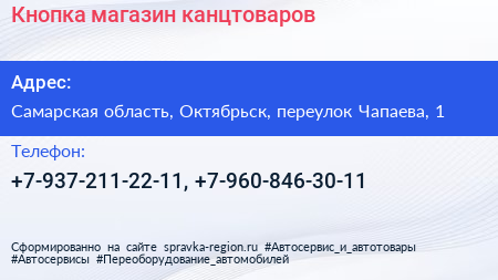 Кнопка, магазин канцтоваров по адресу Самарская область, Октябрьск, переулок Чапаева, 1 в дальнейшем Организация, размещена в следующих категориях: