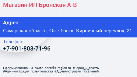 Магазин, ИП Бронская А.В. по адресу Самарская область, Октябрьск, Кирпичный переулок, 21 в дальнейшем Организация, размещена в следующих категориях: