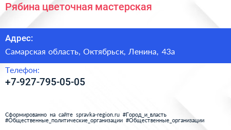 Рябина, цветочная мастерская по адресу Самарская область, Октябрьск, Ленина, 43а в дальнейшем Организация, размещена в следующих категориях: