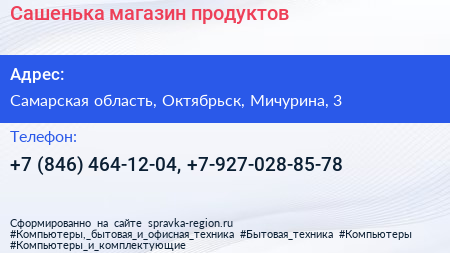 Сашенька, магазин продуктов по адресу Самарская область, Октябрьск, Мичурина, 3 в дальнейшем Организация, размещена в следующих категориях: