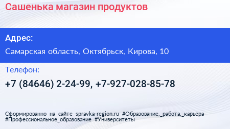Сашенька, магазин продуктов по адресу Самарская область, Октябрьск, Кирова, 10 в дальнейшем Организация, размещена в следующих категориях: