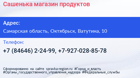 Сашенька, магазин продуктов по адресу Самарская область, Октябрьск, Ватутина, 10 в дальнейшем Организация, размещена в следующих категориях: