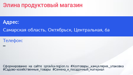 Элина, продуктовый магазин по адресу Самарская область, Октябрьск, Центральная, 6а в дальнейшем Организация, размещена в следующих категориях:
