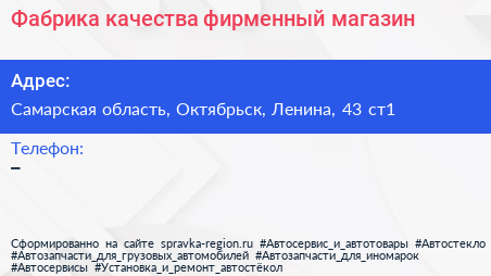 Фабрика качества, фирменный магазин по адресу Самарская область, Октябрьск, Ленина, 43 ст1 в дальнейшем Организация, размещена в следующих категориях: