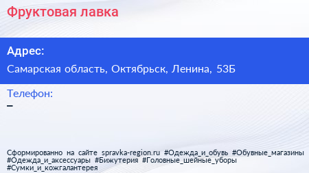 Фруктовая лавка по адресу Самарская область, Октябрьск, Ленина, 53Б в дальнейшем Организация, размещена в следующих категориях: