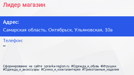 Лидер, магазин по адресу Самарская область, Октябрьск, Ульяновская, 10а в дальнейшем Организация, размещена в следующих категориях: