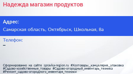 Надежда, магазин продуктов по адресу Самарская область, Октябрьск, Школьная, 8а в дальнейшем Организация, размещена в следующих категориях:
