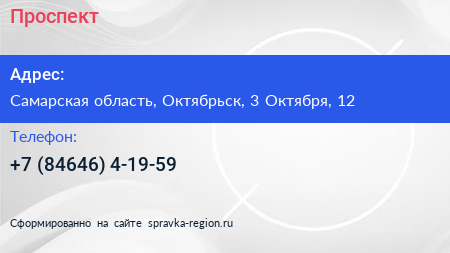 Проспект по адресу Самарская область, Октябрьск, 3 Октября, 12 в дальнейшем Организация, размещена в следующих категориях: