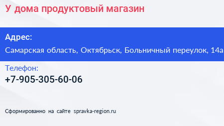 У дома, продуктовый магазин по адресу Самарская область, Октябрьск, Больничный переулок, 14а в дальнейшем Организация, размещена в следующих категориях: