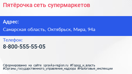 Пятёрочка, сеть супермаркетов по адресу Самарская область, Октябрьск, Мира, 94а в дальнейшем Организация, размещена в следующих категориях: