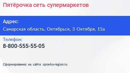 Пятёрочка, сеть супермаркетов по адресу Самарская область, Октябрьск, 3 Октября, 15а в дальнейшем Организация, размещена в следующих категориях: