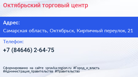 Октябрьский, торговый центр по адресу Самарская область, Октябрьск, Кирпичный переулок, 21 в дальнейшем Организация, размещена в следующих категориях: