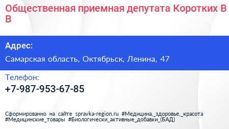 Общественная приемная депутата Коротких В.В. по адресу Самарская область, Октябрьск, Ленина, 47 в дальнейшем Организация, размещена в следующих категориях: