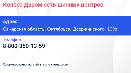 Колеса Даром, сеть шинных центров по адресу Самарская область, Октябрьск, Дзержинского, 109а в дальнейшем Организация, размещена в следующих категориях: