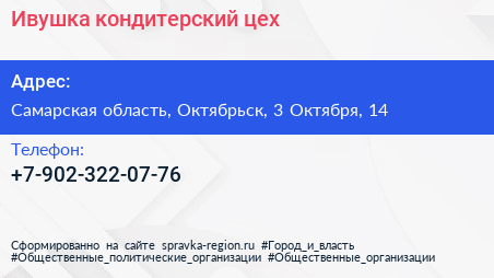 Ивушка, кондитерский цех по адресу Самарская область, Октябрьск, 3 Октября, 14 в дальнейшем Организация, размещена в следующих категориях: