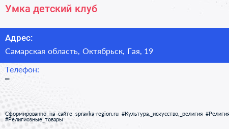 Умка, детский клуб по адресу Самарская область, Октябрьск, Гая, 19 в дальнейшем Организация, размещена в следующих категориях: