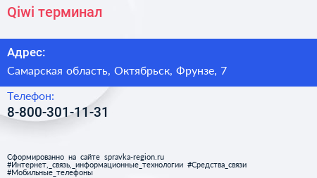 Qiwi, терминал по адресу Самарская область, Октябрьск, Фрунзе, 7 в дальнейшем Организация, размещена в следующих категориях: