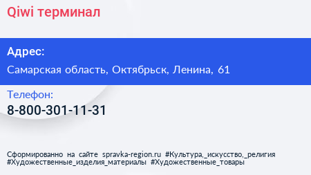 Qiwi, терминал по адресу Самарская область, Октябрьск, Ленина, 61 в дальнейшем Организация, размещена в следующих категориях: