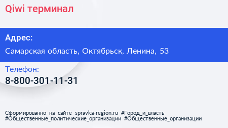 Qiwi, терминал по адресу Самарская область, Октябрьск, Ленина, 53 в дальнейшем Организация, размещена в следующих категориях:
