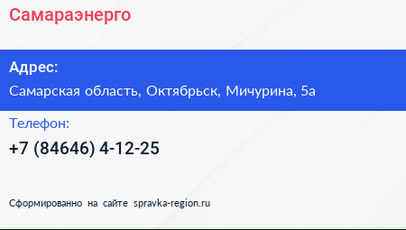 Самараэнерго по адресу Самарская область, Октябрьск, Мичурина, 5а в дальнейшем Организация, размещена в следующих категориях: