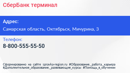 СберБанк, терминал по адресу Самарская область, Октябрьск, Мичурина, 3 в дальнейшем Организация, размещена в следующих категориях: