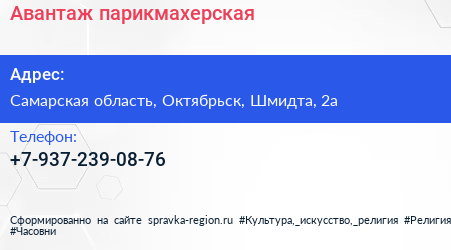 Авантаж, парикмахерская по адресу Самарская область, Октябрьск, Шмидта, 2а в дальнейшем Организация, размещена в следующих категориях:
