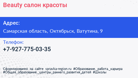 Beauty, салон красоты по адресу Самарская область, Октябрьск, Ватутина, 9 в дальнейшем Организация, размещена в следующих категориях: