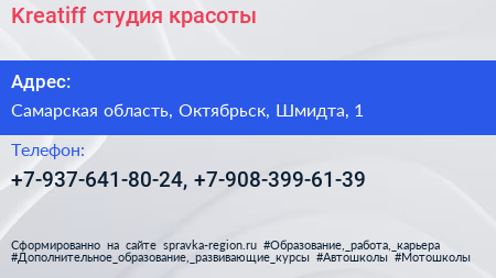 Kreatiff, студия красоты по адресу Самарская область, Октябрьск, Шмидта, 1 в дальнейшем Организация, размещена в следующих категориях: