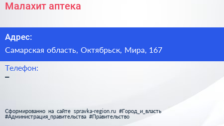 Малахит, аптека по адресу Самарская область, Октябрьск, Мира, 167 в дальнейшем Организация, размещена в следующих категориях: