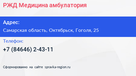 РЖД-Медицина, амбулатория по адресу Самарская область, Октябрьск, Гоголя, 25 в дальнейшем Организация, размещена в следующих категориях: