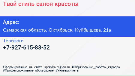 Твой стиль, салон красоты по адресу Самарская область, Октябрьск, Куйбышева, 21а в дальнейшем Организация, размещена в следующих категориях: