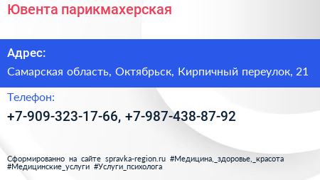 Ювента, парикмахерская по адресу Самарская область, Октябрьск, Кирпичный переулок, 21 в дальнейшем Организация, размещена в следующих категориях: