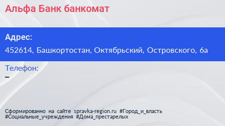 Альфа-Банк, банкомат по адресу 452614, Башкортостан, Октябрьский, Островского, 6а в дальнейшем Организация, размещена в следующих категориях: