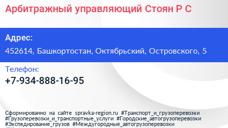 Арбитражный управляющий Стоян Р.С. по адресу 452614, Башкортостан, Октябрьский, Островского, 5 в дальнейшем Организация, размещена в следующих категориях: