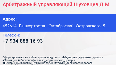 Арбитражный управляющий Шуховцев Д.М. по адресу 452614, Башкортостан, Октябрьский, Островского, 5 в дальнейшем Организация, размещена в следующих категориях: