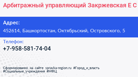 Арбитражный управляющий Закржевская Е.С. по адресу 452614, Башкортостан, Октябрьский, Островского, 5 в дальнейшем Организация, размещена в следующих категориях:
