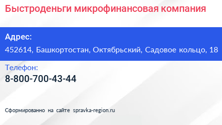 Быстроденьги, микрофинансовая компания по адресу 452614, Башкортостан, Октябрьский, Садовое кольцо, 18 в дальнейшем Организация, размещена в следующих категориях: